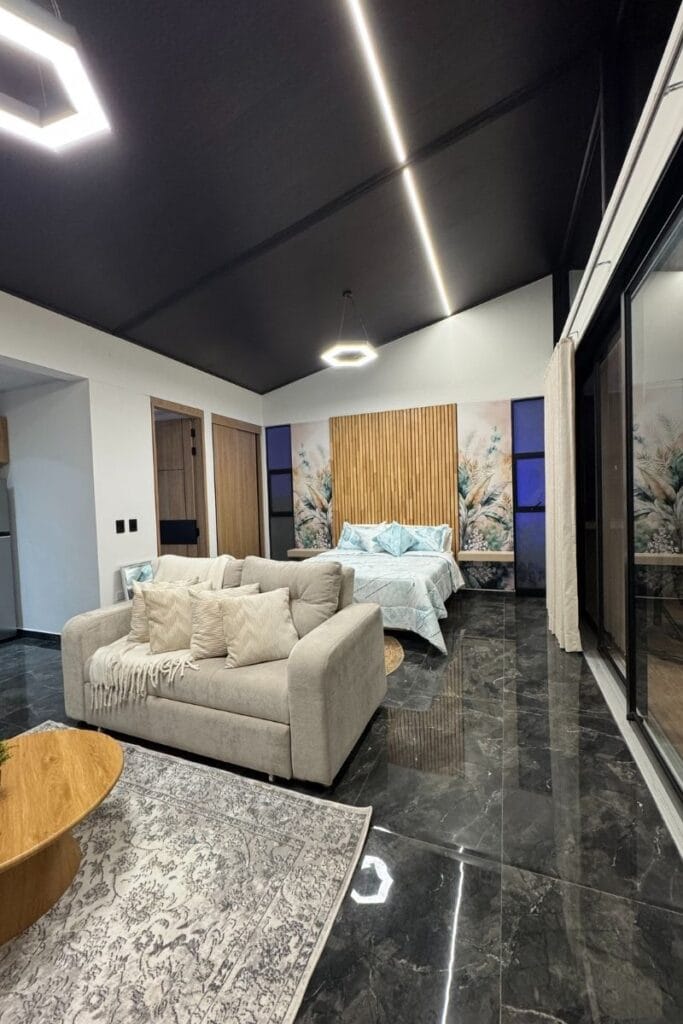 Cada glamping está pensado para que descanses sin interrupciones: cama, sofá, cocina equipada, baño privado, parqueadero privado y jacuzzi.